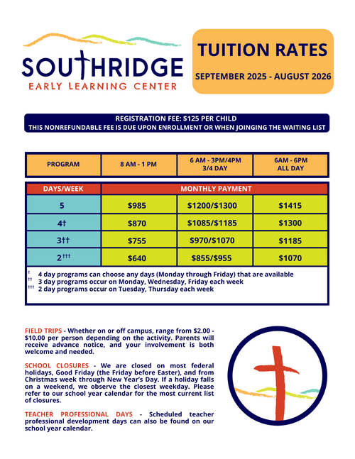 Southridge Early Learning Center exists to expand the mission of Southridge Church, proclaiming the life-giving news of Jesus, to our Center’s children and their families.