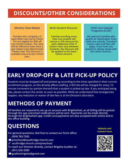 Southridge Early Learning Center is a ministry of Southridge Church in Kennewick, WA. Our licensed preschool serves families across the Tri-Cities by providing a warm, nurturing, Christ-centered environment for children ages 2.5 to 6. We partner with parents and families in the physical, spiritual, emotional, social, and academic growth of their little ones, helping each child feel loved, confident, and ready to thrive. Our program is designed to prepare children for kindergarten and equip them with the tools they need to grow in every area of life. With a beautiful, engaging facility and caring teachers, your child will feel right at home!